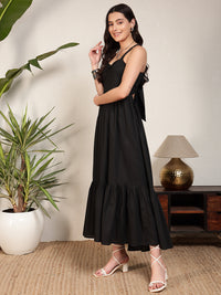 The Midnight Bow Maxi is an elegant A-line maxi dress designed with a flattering sweetheart neckline and subtle bust detailing for enhanced shape. It features adjustable shoulder straps and a charming back bow that complements the open back design, adding a feminine and stylish touch. The floor-length silhouette is completed with a tiered ruffle hem and gathered empire waist, offering a graceful look suitable for various occasions. Made from breathable poly rayon fabric, this dress ensures comfort and ease, especially perfect for summer wear and casual outings.