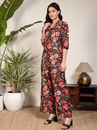 Rich & Bold Floral Print: The most striking feature is the vibrant and detailed floral and botanical print in shades of red, pink, yellow, and green, set against a sophisticated black background, creating a visually rich and impactful design.